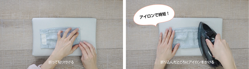 塗った部分を内側に折って貼り付け、輪を作ります。アイロンをかけると速乾作用で時短になります。